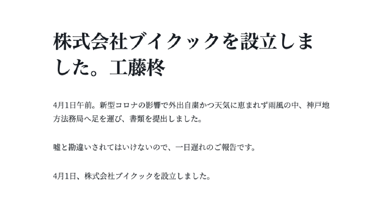 「株式会社ブイクック」の誕生を祝い、来年の誕生日を僕は楽しみにしています。