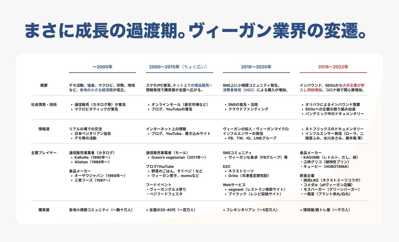 ここまでまとめてきた通り、ヴィーガン業界構造の変遷をまとめると、このようになる。